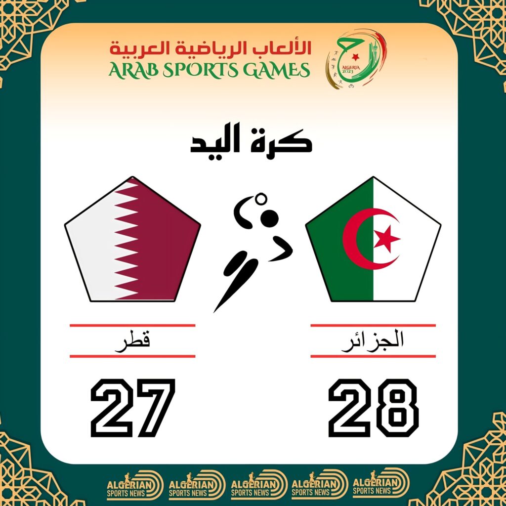 حقق منتخبنا الوطني لكرة اليد للرجال فوزا صعبا على المنتخب القطري في منافسات كرة اليد للرجال بالدورة العربية ( الجزائر 2023) والتي أقيمت مساء اليوم الجمعة بمدينة وهران.