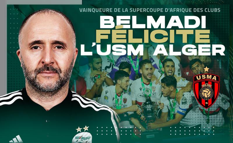 كشف الموقع الرسمي للاتحاد الجزائري لكرة القدم اليوم الأحد أن الناخب الوطني جمال بلماضي قدم تهانيه إلى الطاقم الفني لنادي اتحاد العاصمة وكل اللاعبين على انجازهم التاريخي عقب إضافة لقب سيضيف فخرًا لكرة القدم الجزائرية وسيبشر بالتأكيد بتتويجات أخرى في المستقبل.