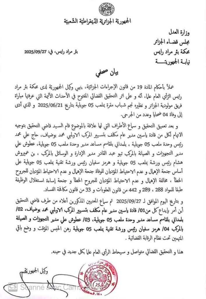وأضاف البيان أنه بتاريخ 27 سبتمبر 2025، قرر قاضي التحقيق إيداع كل من قادة ياسين، بلمداني بلقاسم، عطوش علي، وهرمز سفيان الحبس المؤقت، فيما وُضع باقي المتهمين تحت الرقابة القضائية.