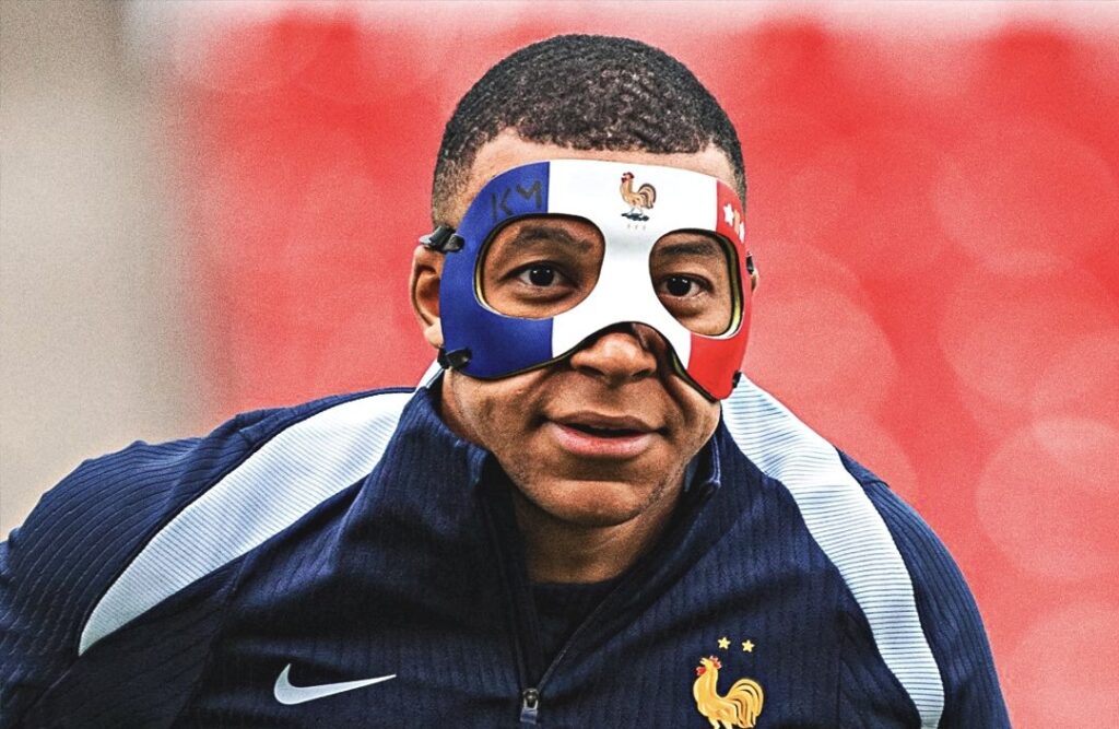 بعدما تعرض لكسر في الأنف في المباراة الأولى لمنتخب بلاده أمام النمسا يوم الإثنين الماضي ، ظهر نجم منتخب فرنسا كيليان مبابي امس الخميس و هو يرتدي قناعاً طبيا خلال التدريبات يحمل ألوان علم فرنسا وشعار المنتخب الفرنسي، بالإضافة إلى الأحرف الأولى من اسمه باللغة الإنجليزية.