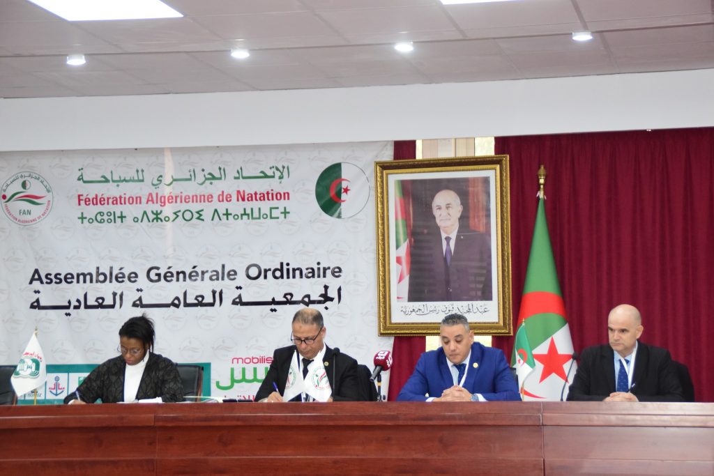 صادق أعضاء الإتحاد الجزائري للسباحة و على رأسها السيد محمد حكيم بوغدو صبيحة اليوم على الجمعية العامة العادية في دورة استثنائية، حيث أجمع بالأغلبية على التسمية والشعار الجديدين للهيئة الفيدرالية خلال الأشغال التي جرت بالمركز الصحافة الدولي للمركب الأولمبي محمد بوضياف حيث عرفت أشغال الجمعية العامة العادية حضور 37 عضوا من بين الـ 54 عضوا وبحضور ممثلة من وزارة الشباب والرياضة، سارة لمغربي، ومحافظ الحسابات، عبد القادر أقبو ح