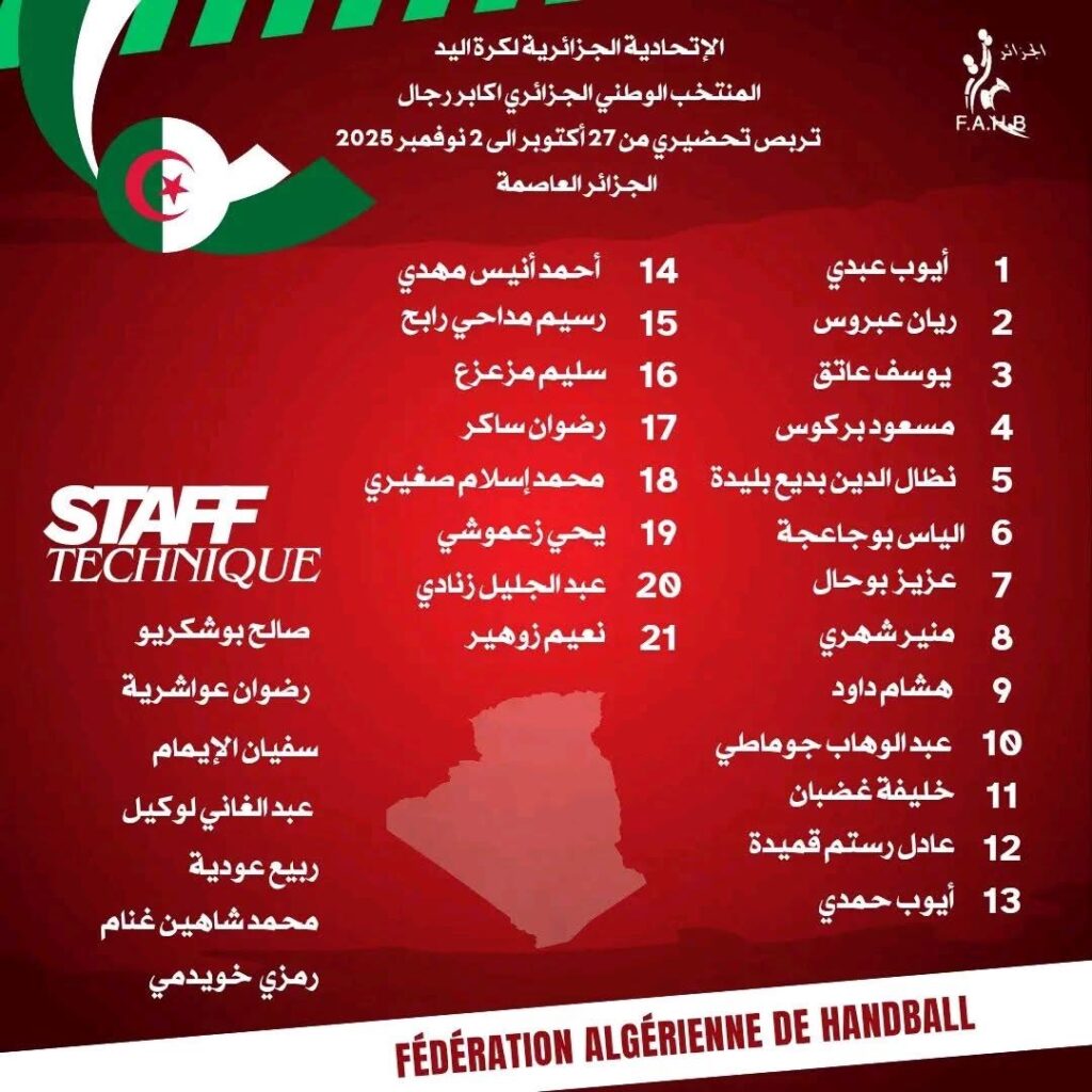 أعلنت الاتحادية الجزائرية لكرة اليد عن قائمة المنتخب الوطني للأكابر، المعنية بالدخول في تربص تحضيري من 27 أكتوبر إلى 2 نوفمبر 2025 بالعاصمة الجزائر.