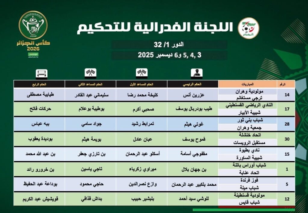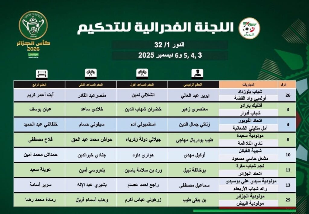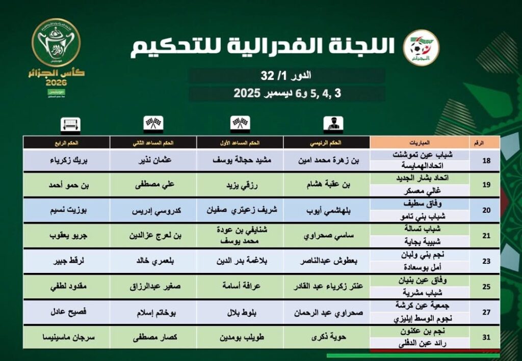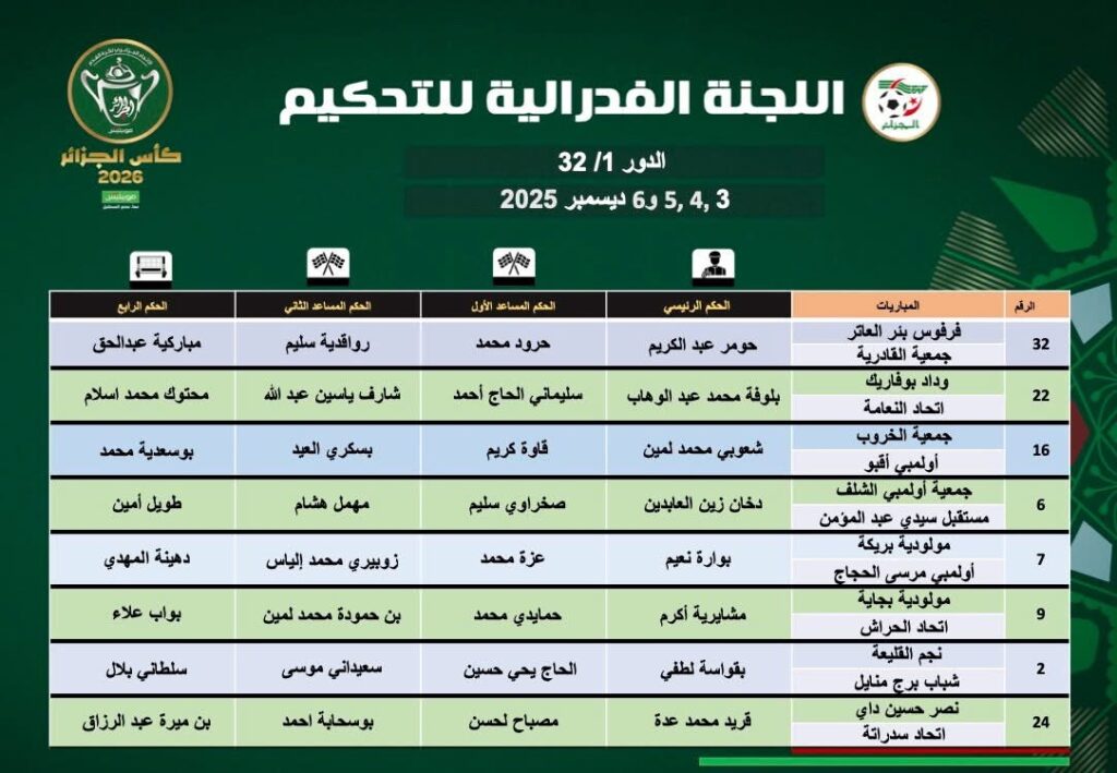 أعلن الاتحاد الجزائري لكرة القدم “الفاف”، اليوم الأحد، عن التعيينات الرسمية لحكام مباريات الدور الـ32 من منافسة كأس الجزائر.
