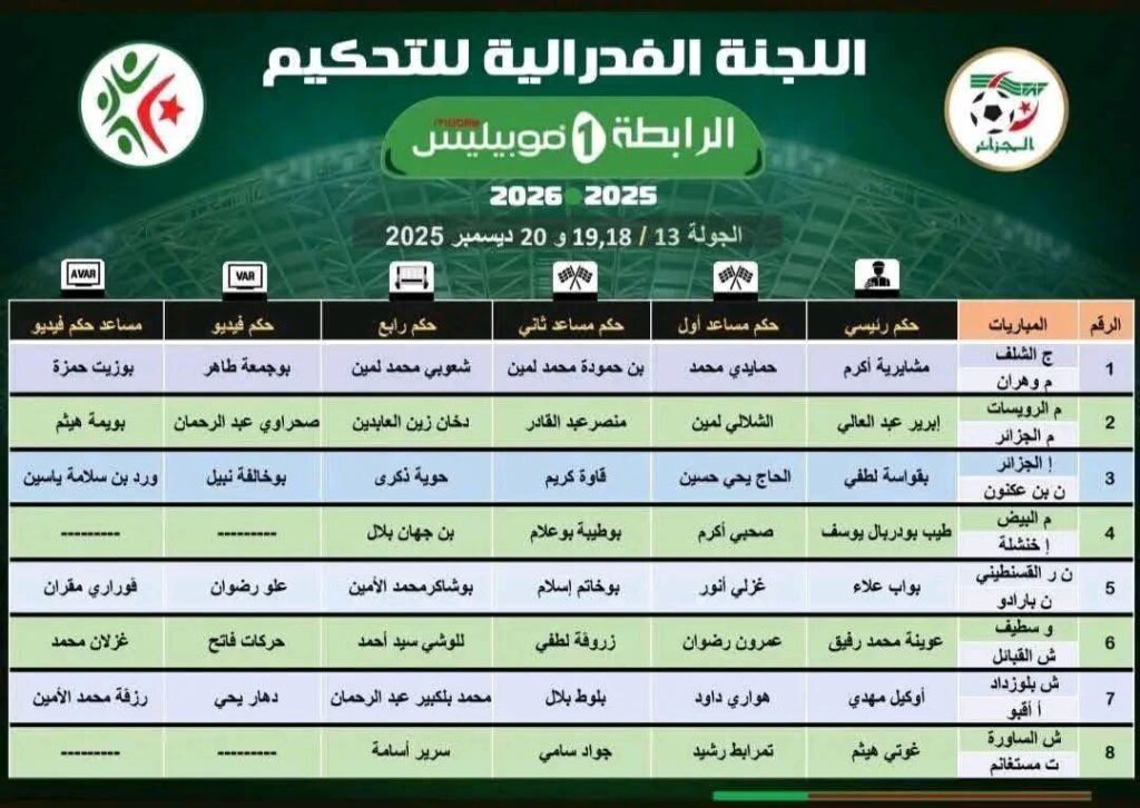 وتُعد هذه الجولة من بين أبرز جولات الموسم، بالنظر إلى المواجهات القوية التي تحملها، وفي مقدمتها القمة المرتقبة التي ستجمع أولمبي الشلف بمولودية وهران، حيث أُسندت إدارتها للحكم مشارية أكرم، بمساعدة حمايدي محمد وبن حمودة محمد أمين، فيما سيكون بوجمعة طاهر مسؤولًا عن تقنية حكم الفيديو المساعد (VAR) بمعية بوزيت حمزة.