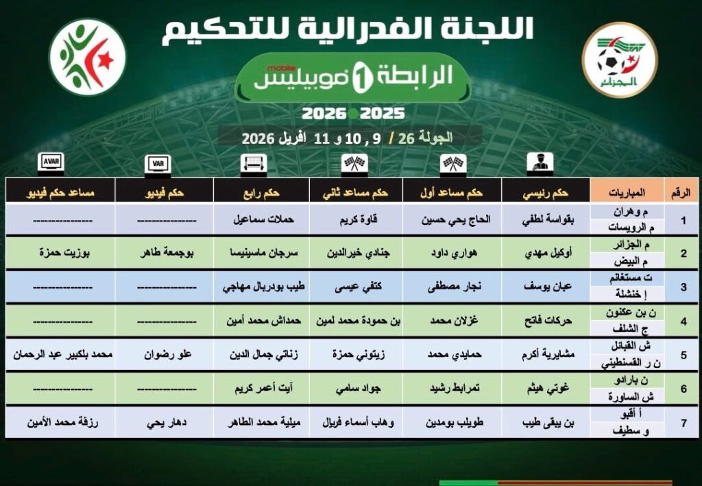 كشفت اللجنة الفيدرالية للتحكيم التابعة للاتحاد الجزائري لكرة القدم، اليوم الثلاثاء، عن تعيينات حكام مباريات الجولة الـ26 من الرابطة المحترفة الأولى، المقررة أيام 9 و10 و11 أفريل.