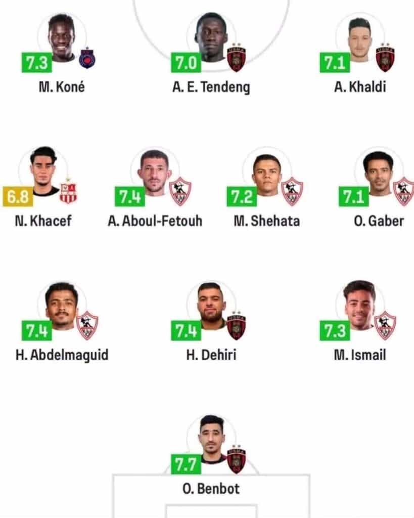 وضمت التشكيلة أيضًا ثلاثة لاعبين آخرين من الاتحاد، يتقدمهم حسين دهيري الذي حصل على ثاني أفضل تقييم بـ7.4، إلى جانب أحمد خالدي صاحب هدف التأهل في شباك أولمبيك آسفي بتقييم 7.1، إضافة إلى السنغالي إيتيان تيندينغ الذي نال علامة 7 من 10.