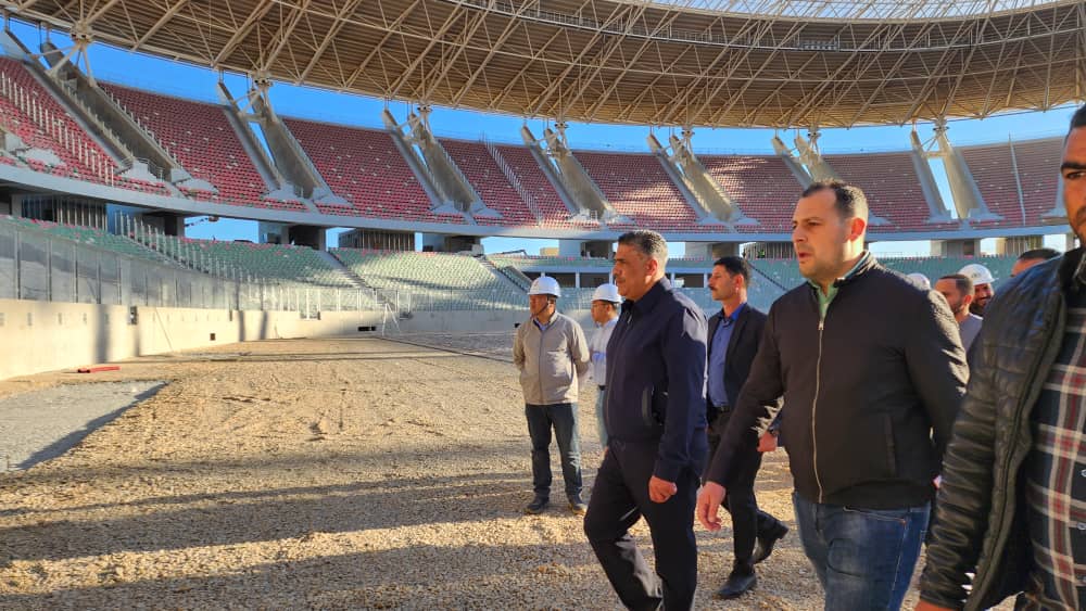 استهلت الزيارة بتفقد أشغال تركيب الكراسي والتي بلغت نسبة إنجازها 98%، لينتقل بعد ذلك إلى أرضية الملعب التي إنتهت بها أشغال وضع الطبقة الهجينة.