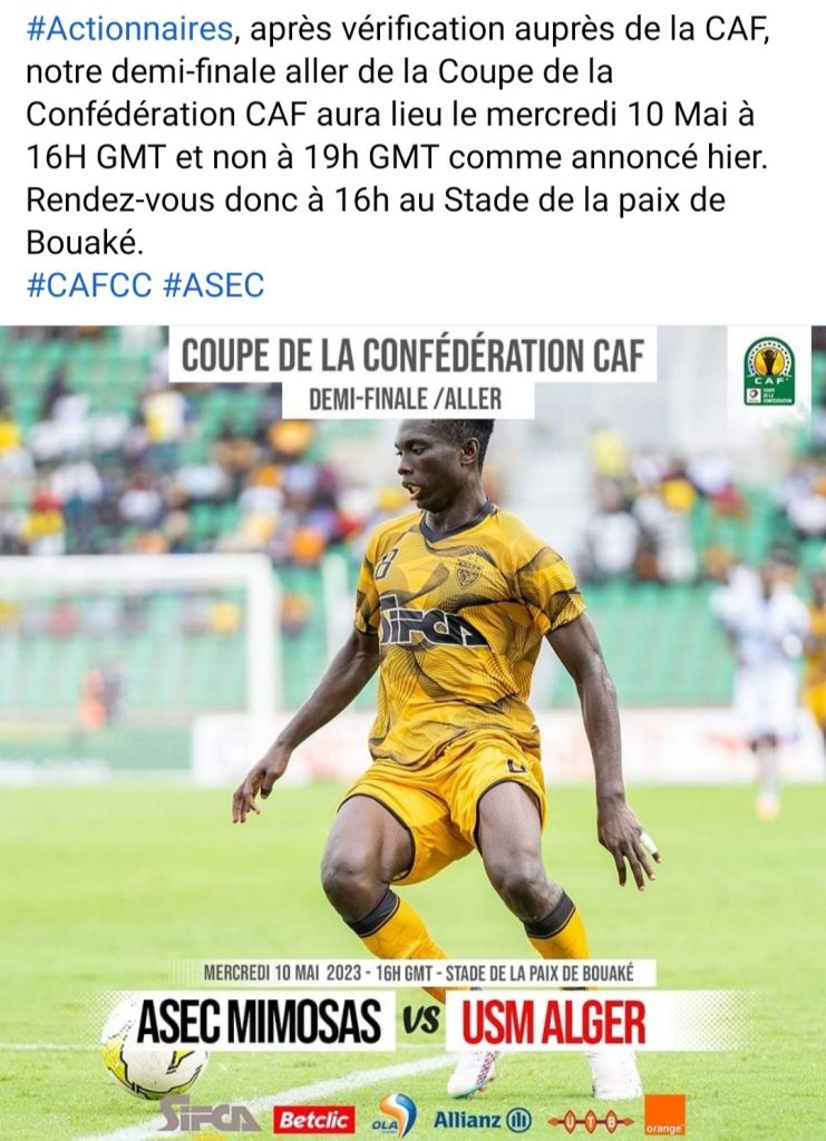 أعلن نادي اسيك ميموزا عن تغيير توقيت مباراة ذهاب نصف نهائي كأس الكاف ضد إتحاد العاصمة بحيث ستكون المباراة الأربعاء 10 ماي على الساعة 17:00 بتوقيت الجزائر .
